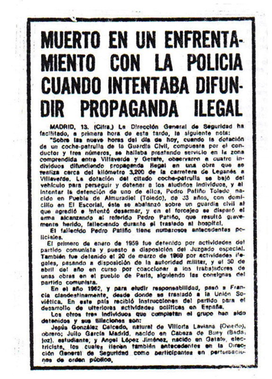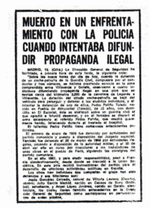 La versión del régimen afirmó que se abalanzó sobre el policía, sin embargo las heridas las tenía en la espalda. Esto ocurrió en el kilómetro 3,200 de la carretera de Leganés a Villaverde. Iba acompañado de Jesús Gonzalez Calcedo, Ángel López Jiménez y Julio García Madrid.