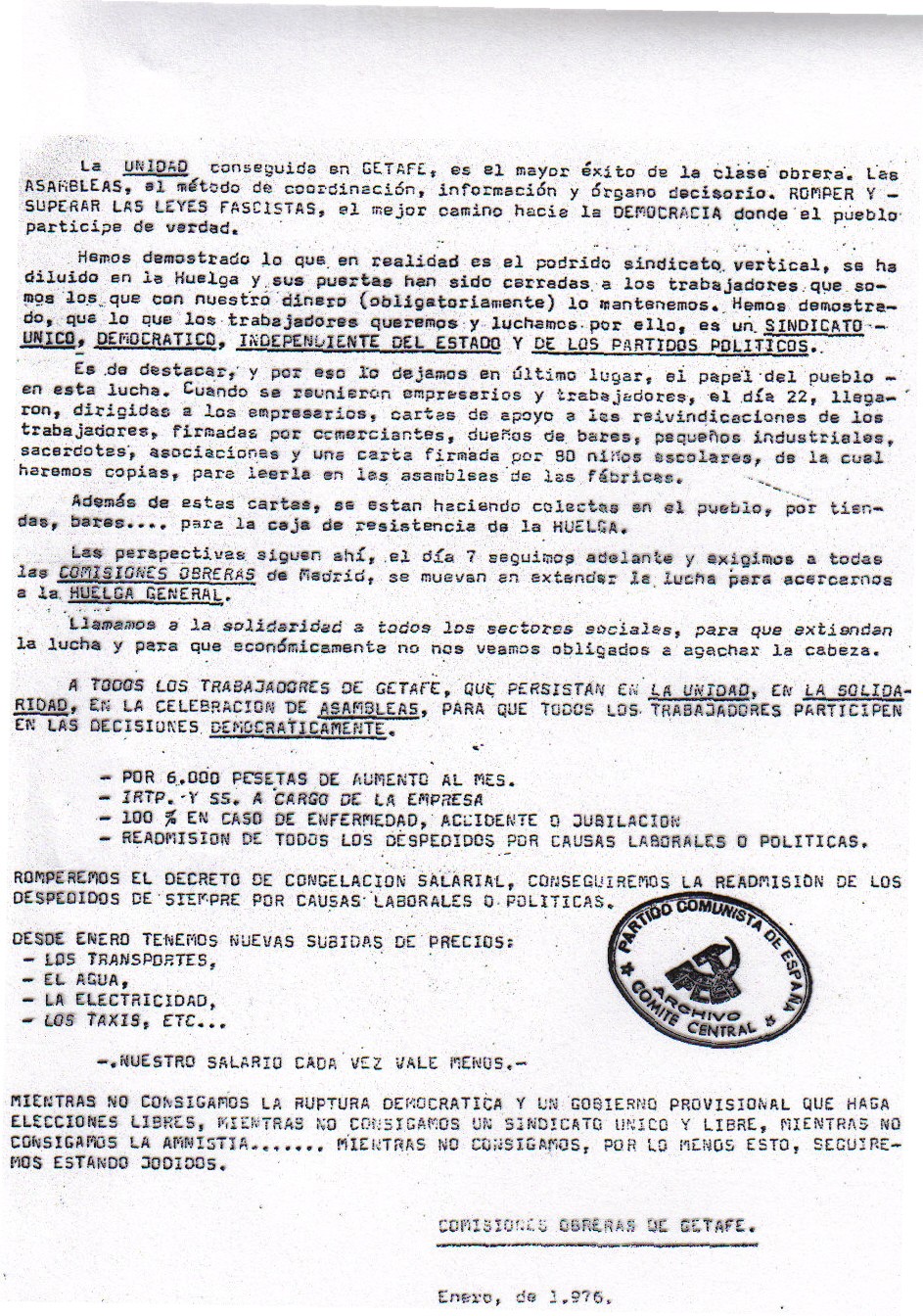 En Getafe, en el mes de enero, siguen en conflicto más de 15.000 trabajadores entre huelgas y cierres patronales. La situación es de casi huelga general que durará casi un mes, a partir de los días 9 y 10, con cierres de establecimientos y comercios. Se realiza una manifestación de 10.000 personas ante el Ayuntamiento en solicitud de amnistía.