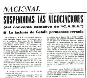 En Getafe se están negociando conflictivamente, los convenios de CASA, INTELSA y Kelvinator.. El día 11 de diciembre la zona se encuentra en situación de huelga general.